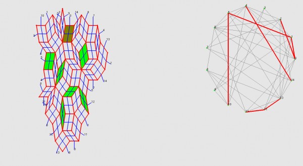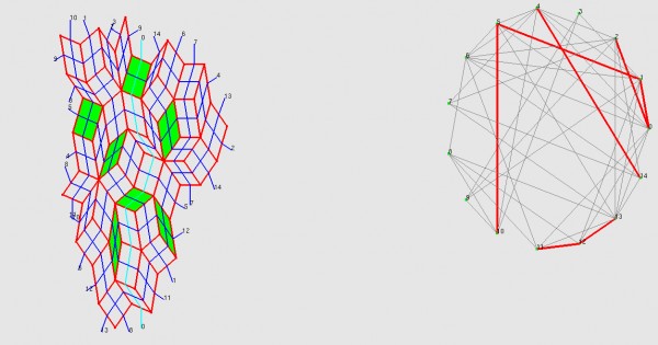 The graph on the right side of the screen has nodes that represent each ribbon, and edges that represent the intersection of two ribbons. If the face is at which two points intersect is selected, the edge is drawn red - else, it is drawn grey. The WesterGame is "won" when it has been minimally fully braced. The quasicrystal if fully braced if the graph on the right is connected (all nodes can be traversed by walking along the red edges). The minimum number of highlighted edges needed for it to be braced is 14. Best of luck!