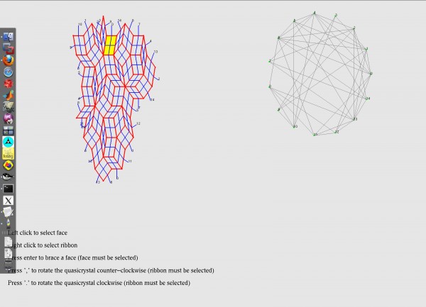 So, clicking with left mouse button on the structure on the left hand side of the screen (the quasicrystal), you can select some of the faces of the quasicrystal. After doing so, you can press enter to make the faces unalterable, outside of rotating them (braced). I did this by transforming every line segment of each rhombus into a different line, each with the formula "y = mx + b". I then found the location of where the user clicked and checked between which set of lines it was in. By hitting the enter button, it turns the corresponding face green (deselecting also uses enter, and returns the color to white).