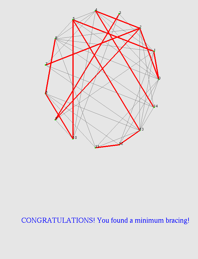 In this RTICA, the user sees a series of rhombuses (faces) that share edges, a graph with 15 nodes, and a series of instructions. By bracing a certain number of the faces, one hopes to fully brace the shape, such that you cannot bend the shape along any blue line (ribbon)