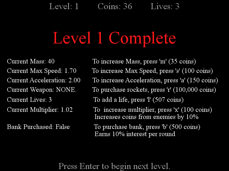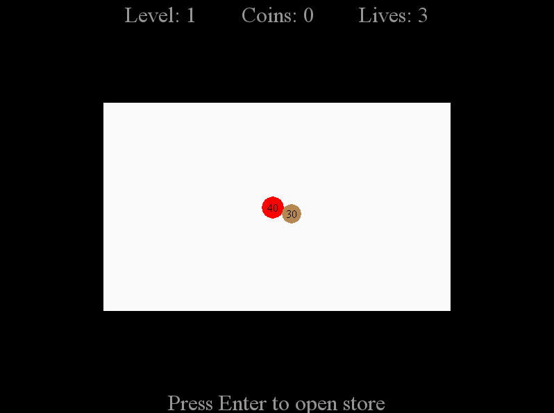 At the end of each level, you are brought to the store, where you can spend your hard earned coins to upgrade your ball. Purchasing speed will increase the maximum rate at which your ball can travel across the screen. Purchasing acceleration will increase the rate at which you can reach your max speed, stop, or change directions. Purchasing mass will increase the number displayed in the center of your ball. When you have more mass moving at a higher speed, your ball will have a higher momentum and therefore be able to hit the enemies harder. Instead of upgrading yourself, you can instead choose to "invest" your coins by increasing your multiplier or purchasing a bank. Both will increase the amount of coins you earn on later levels in different ways. It might take some practice to find the right balance between investing and upgrading.