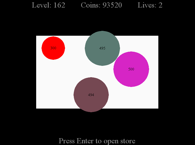 The idea of the game is to put the user in control of a rubber ball. The user will earn coins as he or she progresses through a number of levels. The coins can then be used to increase the mass, speed, acceleration, etc. of his or her ball. The objective of each level is to knock a number of artificially intelligent rubber balls off a platform. The collisions will be realistic in that they will exhibit a conservation of momentum. The game is written in Python with the help of the PyGame module, which can be found here.