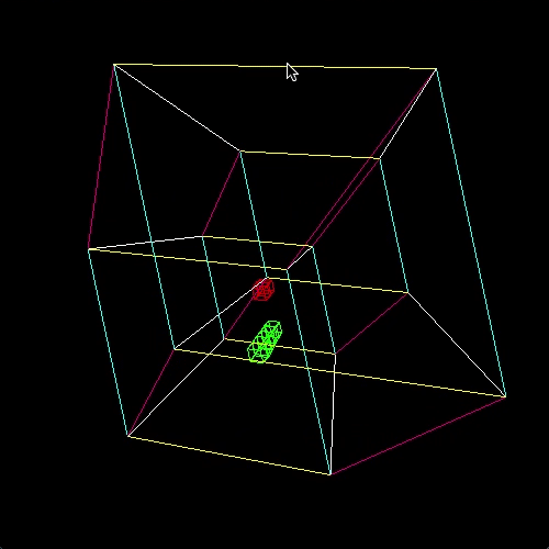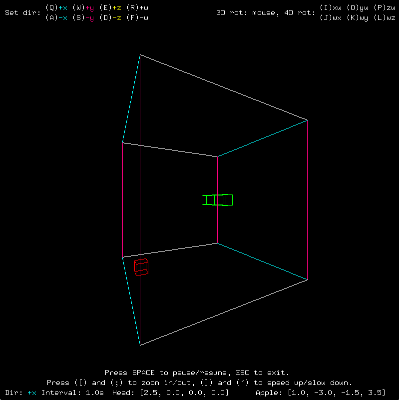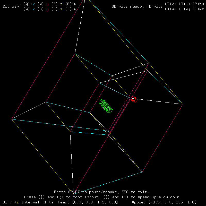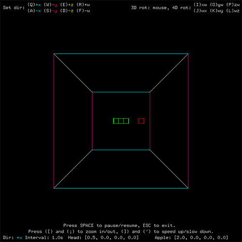 There it is! However, what we thought was a simple cube was actually a tesseract, or a four-dimensional hypercube, the four-dimensional analog of a cube. Each body element of the snake and the apple are also hypercubes. Telling the snake to go in a certain direction may cause it instead to start becoming larger or smaller. Try using 4D rotations to straighten it out. Also, notice how the axes that are not in the rotating plane maintain their orientation. We are used to seeing only one axis fixed when an object rotates in three dimensions. Now, two axes are fixed. The important thing to understand is that we are not actually seeing a four-dimensional wireframe, merely its three-dimensional shadow caused by a "flashlight" that I have set at position w = 10 pointing in the negative w direction. For more commentary about the nature of simple four-dimensional geometry, please refer to the documentation. The following is an animation of HyperSnake in action.