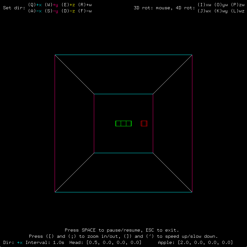 Strange! We are told that pressing (I) will result in a 4D rotation, but the game space appears to be a simple cube rotating in 3D! There is more to this than meets the eye. Let's reset the game. This time, once the head's x coordinate reaches 0.0 again, press (E) to make the snake go in the positive z direction - or out of the screen. Now press (I) several times to do that "3D" rotation trick that we saw before. That should let us see the side of the snake, right?