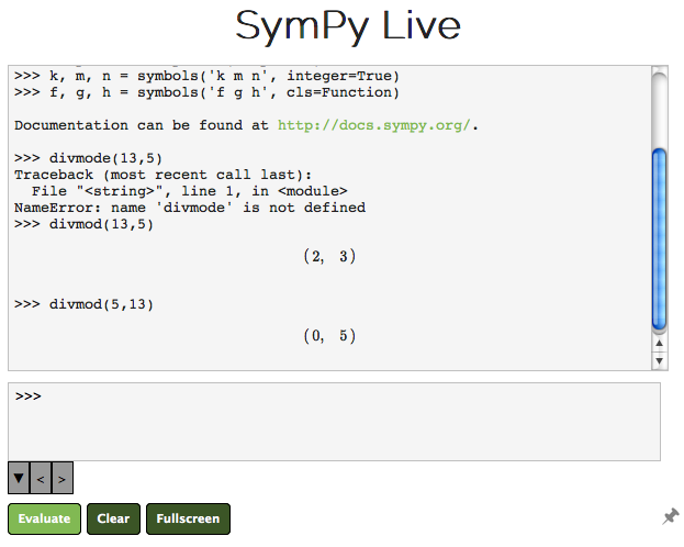 Finally, we want to extend Python's vocabulary of functions. Let's call it \texttt{ldv(a,b)} for "long division of $a$ by $b$". But right away, I made a mistake. I tried to use the function before I defined it. Poor Python does not understand. To enter the following into Python you write the first line, the one with the >>> as prompt, and don't forget the semicolon. \textbf{WAIT}, don't press the enter/return key. That will give another error, because of the semicolon. The semicolon tells Python that there is more to come. You must press \textbf{Shift-Enter}. This tell Python to give you the three dot prompt, and automatically indents the next line. Remembering the indentation is a headache in Python, so SymPy Live does it for you. You should recognize the next two lines. When you are done writing a Python program (yup, you have just programmed Python by defining a new function) press the ordinary enter key. That ends the programming and you're ready to test your new function. \end{document}