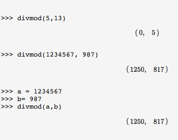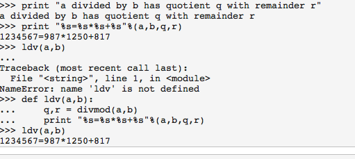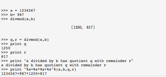 We next make Python do a long division you have no desire to do yourself. I bet you didn't know that $1234567 = 987*1250 + 817$. Now you do. Then, assign the dividend to a variable named "a". You could have named it "dividend", but that takes more writing and isn't math, it's computer science. Note that once the variables have a value you can use them in the function and get the same result. That's reassuring! \subsection{Formatted Printing}